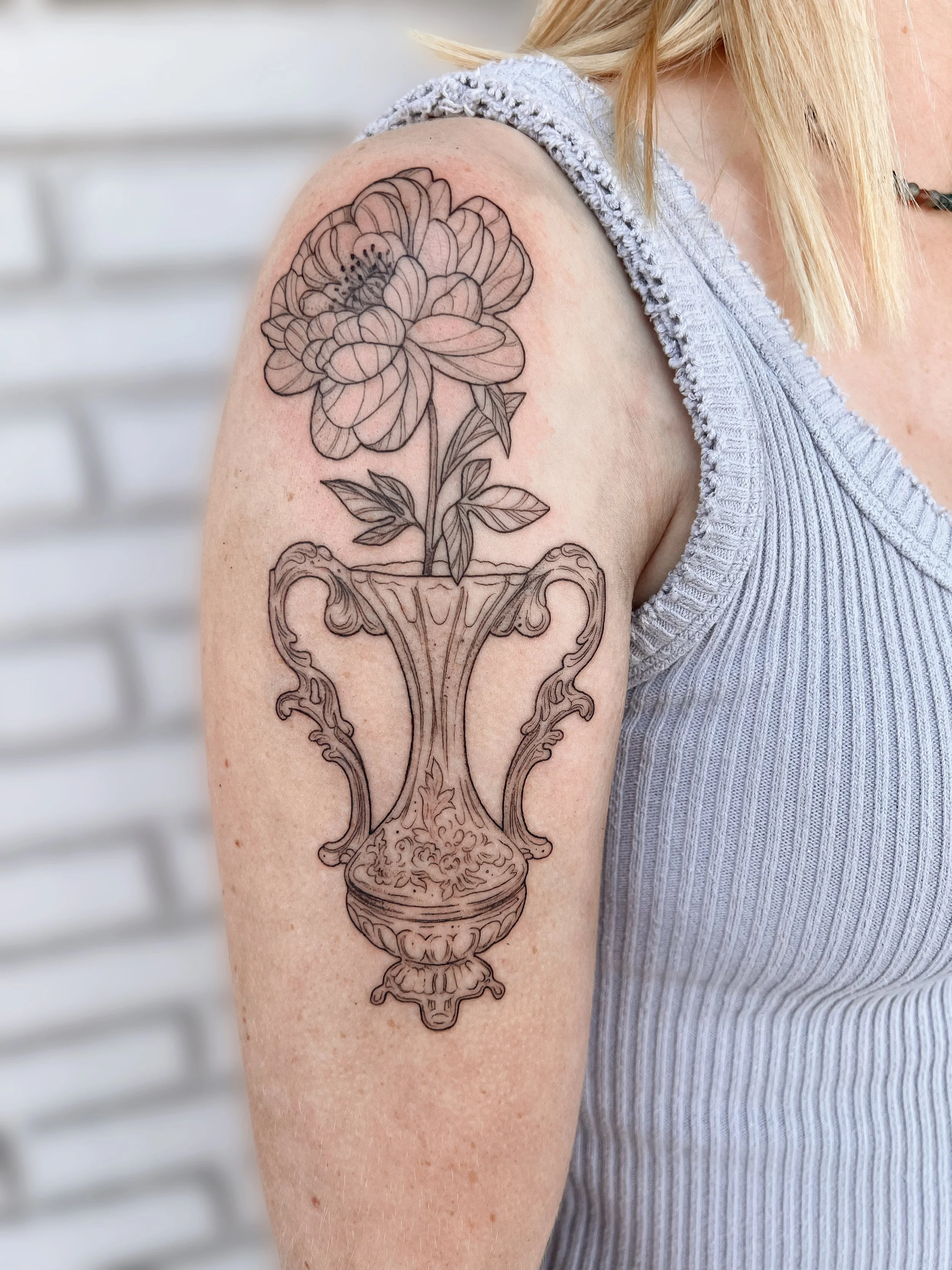 Her work encompasses sea life, ornamental jewelry designs, Victorian imagery, fantasy motifs, and an overall delicate (yet darker) taste in tattooing. She uses black and gray only, and would love to start venturing into larger concept pieces.
